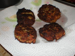 Several of the commenters on the recipe over at All Recipes said they had baked the croquettes instead of frying them to make them a little less bad for you. To bake them I mixed them the same way as before and formed them into patties. Then I baked them at 350 degrees F for 10 minutes, flipped and baked them for 10 more minutes.