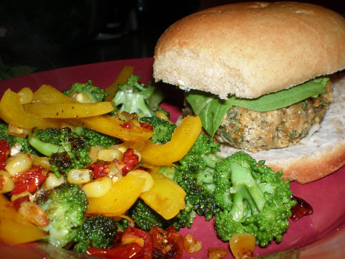 This time I ate them on a wheat bun with a little bit of light Miracle Whip and some arugula. I also cooked up some broccoli, yellow bell peppers (from the garden), corn (from my CSA), and sun dried tomatoes into a veggie mix to go with it. Very yummy!
