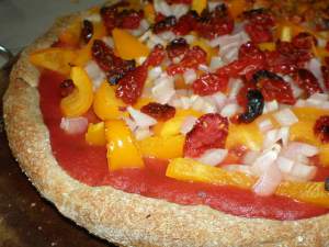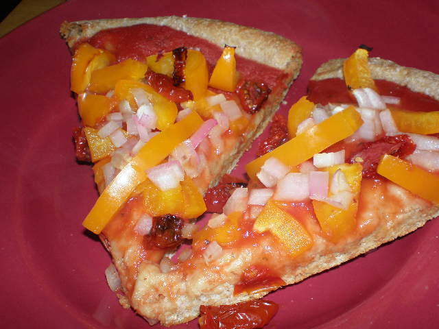 After the pizza has dry baked, spread on sauce and any toppings you want. I had an old can of Italian tomato sauce in the pantry so I just used that. But for an awesome homemade pizza sauce recipe, click here. For toppings I used an orange pepper, red onion and some dried tomatoes soaked in veggie broth (from the garden last year). Ben (my husband) put a little bit of cheese on his half, but I left my half cheese-free. Here is the pizza with toppings pre-bake: