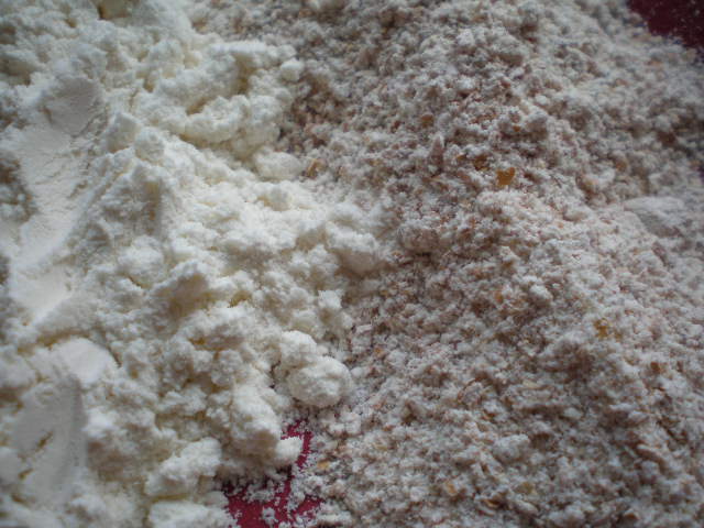 In the picture above, the all-purpose white flour is on the left and regular whole wheat is on the right. There’s clearly a difference between the two.