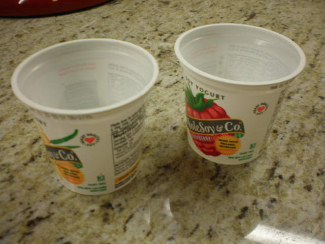 To start you need yogurt containers. After enjoying some yogurt, wash out the container and save it. You can also save any other similar type of container like margarine tubs or sour cream tubs. If you don’t eat yogurt or any of those other things, ask your family, friends, neighbors and coworkers to save their containers for you.