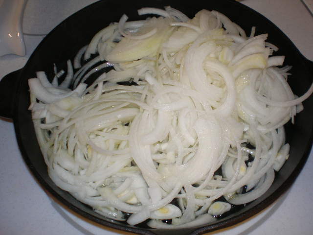 While the pasta is cooking, make the caramelized onions.  Preheat a large, heavy-bottomed pan, preferably cast iron, over medium heat.  Saute the onions in oil until some onion bits are very brown and caramelized, 12-15 minutes.  Set aside.