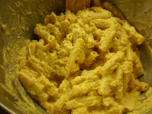 Now place the cashew ricotta in a large bowl and fold in the pumpkin puree, brown sugar, nutmeg, white pepper, cayenne and vegetable broth, and mix.  Add the cooked ziti and caramelized onions, stirring to coat the pasta.  Pour the mixture into the prepared baking pan and press lightly with a rubber spatula to level it.