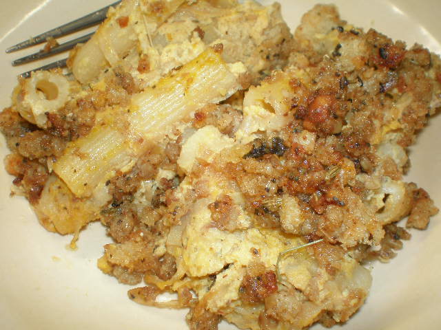 Next make the sage bread crumbs.  Melt margarine in a large, heavy-bottomed skillet over medium heat.  Stir in the bread crumbs, walnuts, dried herbs, and paprika and season with salt and pepper.  Stir constantly until the mixture is lightly coated, 3-4 minutes.  Remove from heat and sprinkle evenly over the ziti.