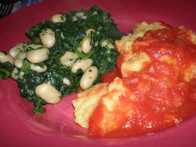 I wanted to share today a recipe for a simple and inexpensive side dish. Spinach and white beans, aka Popeye and Protein, aka PNP. This recipe originates from Rachel Ray’s Express Lane Meals. It’s actually part of another recipe, Cheese and Pepper Pasta and Spinach with White Beans, on page 30. But I make the spinach and white beans by itself all the time.