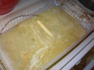 Here’s the butter in the pan. Watch to make sure it doesn’t burn. I almost burned mine. You might want to take the pan out before the butter is all the way melted and let it finish melting on the stovetop.