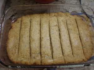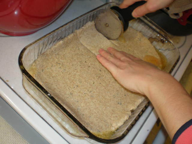 In the pan, cutting into strips with a pizza cutter. Be careful because the pan is hot. I wanted to steady my hand on the side of pan while cutting and almost burned myself!