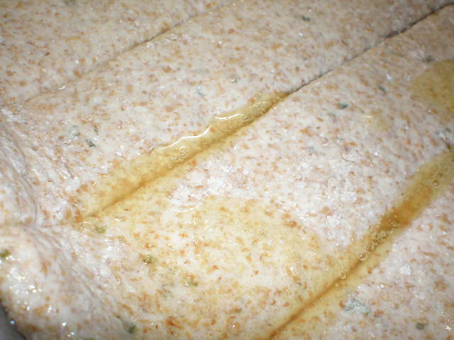 I used 1 1/2 cups white flour and 1 1/2 cups whole wheat flour. I also used soy milk and garlic salt instead of garlic powder & salt (only because I did not have any garlic powder). I did use real butter because we have a bunch that needs to be used, but you could easily substitute Earth Balance if you want.