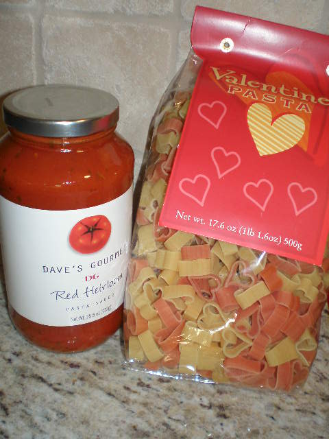 For Valentine’s Day MIL gave us a bag full goodies. Two of those goodies were heart shaped pasta and Dave’s Gourmet heirloom tomato sauce.