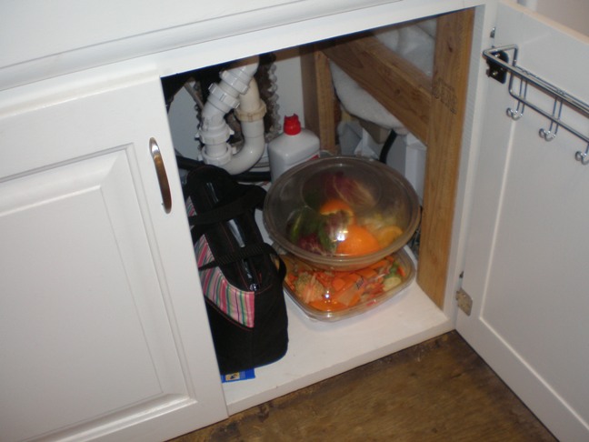 When it’s time to cook, I get one of the containers from under the sink and set it on the counter. As I’m chopping whatever I’m using, the scraps go into the plastic container. The good stuff goes in another bowl. When I’m done I pop the lid back on and put it back under the sink.