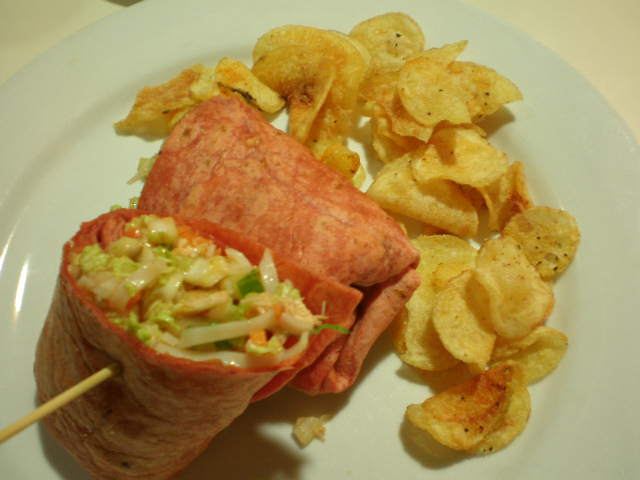 Benzo had the Vietnamese Dim Sum Chicken Wrap with a side of hot-pepper chips: