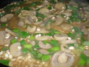 Stir in water, bouillon and salt; bring to a boil. Remove from heat, add onions and mushrooms.