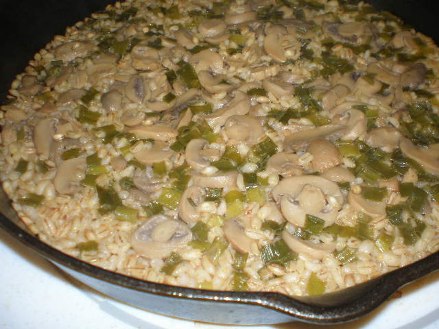 Preheat oven to 350 degrees F. In an oven proof skillet (I used cast iron), saute barley in oil until golden brown.