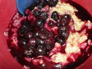 I think next time I make blueberry pancake oatmeal I will stir the blueberries in and then drizzle with maple syrup. That way it will be more like pancakes with syrup on top, instead of having the syrup all mixed together with the oats.