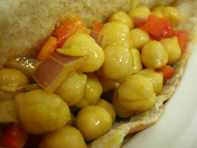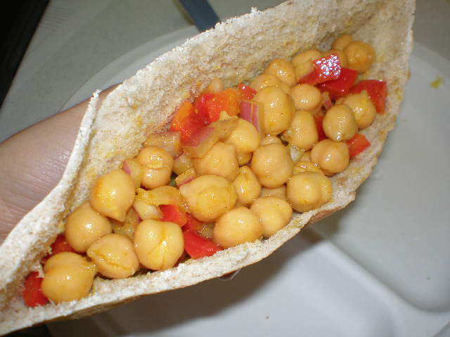 Sounds like a good idea right?  Wrong!  The chickpeas would not stay in the pocket.  They bounced out all over the place.  Out and onto the floor, the desk, the computer and my lap.  Not sure if it was pita pocket user error or what.