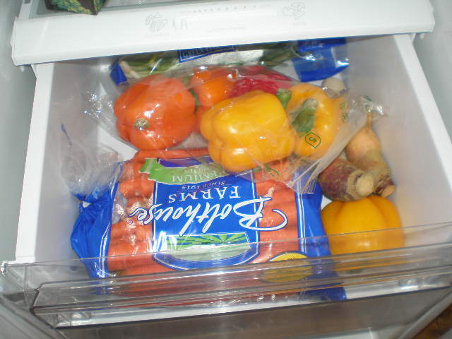 My drawer was actually pretty full. Much more so than normal during the off-season, but we just stocked up at Sam’s Club last weekend. From this drawer I pulled out the carrots, the yellow pepper in the bottom corner that was on its last leg, two rutabegas, and a daikon radish. I’ve actually never had rutabegas or daikon before and wanted to try them, so I picked some up on my last shopping trip.