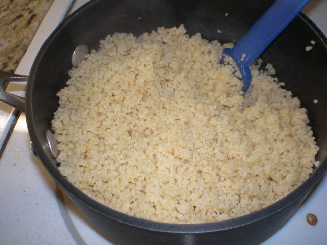 Whole grains go really well with the roasted veggies. Brown rice, quinoa, barley or whole-wheat couscous are options. While the veggies are roasting, make your grain. I chose whole wheat couscous.