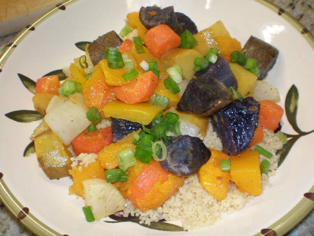 When the roasted vegetables are done, you can assemble it all on a plate or in a bowl. First spoon some couscous or other grain onto the plate. Then top with several scoops of roasted veggies. Finally top with whatever floats your boat. I used chopped green onions. You could also try toasted seasame seeds or nuts, cilantro or parsley.