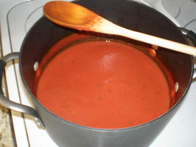 In the freezer I had two containers of roasted roma tomatoes left over not from last year’s garden, but my first garden in 2008! Those tomatoes had been in the freezer for a year and a half. I decided they had been in there long enough and it was time to do something with them. I also had a bag of “basil cubes”, which is just basil frozen into ice cubes. As it’s been getting warmer I’ve been more conscious about eating out of my freezer. I need to get all of last year’s veggies cleared out and eaten before the 2010 veggies start arriving.