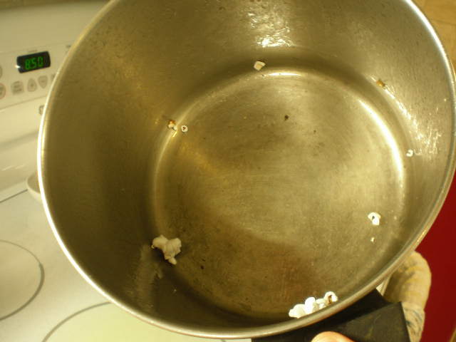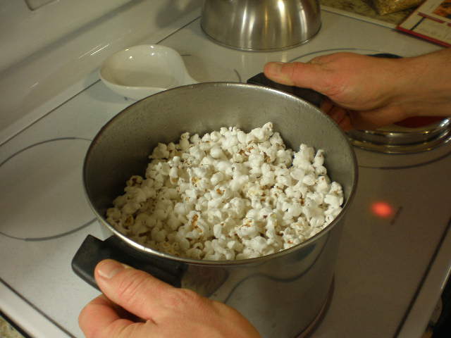When you no longer hear kernals popping or there is a long time between pops, remove pot from heat.  Dump popcorn into a large bowl and sprinkle with a bit of salt.  A little goes a long way so use a light hand!