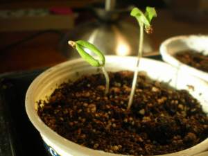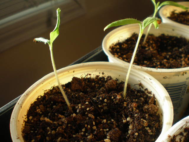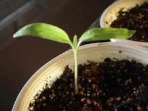 The picture below shows one of my tomato starter pots, where both the seeds I planted have sprouted.