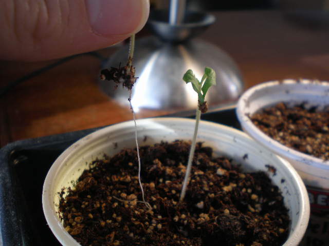 I find that the plants left start getting bigger and stronger really quickly, once I’ve thinned out their competitors. This guy got his own pot last week and he started to sprout another set of leaves right away. I took these pictures last week, so the plants are even bigger now.