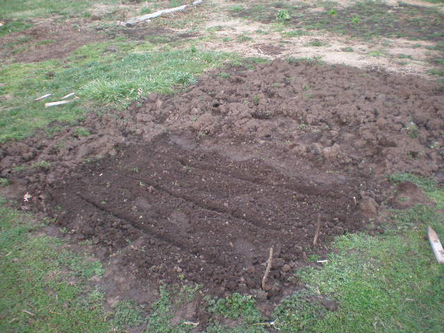 When I got home from work I found Benzo already in the garden breaking up and raking one of the beds. I changed into my garden clothes and headed on out there. The ground is still really wet, but yesterday was our only chance to put anything in the ground. The forecast called for rain today (and it was right) and more rain through the rest of the week and into the weekend. The next sunny warm day is not until Monday and we’ll probably have to wait a few days after that for the ground to dry out before we can plant anything.