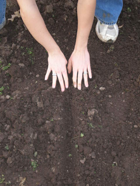 First you need some furrows. Using a hoe or a stick or the handle of a rake, make some furrows.