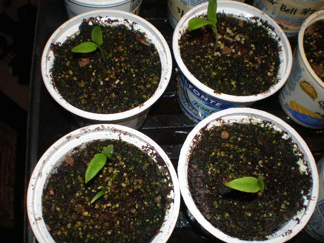 All three pots of green/red bell peppers have sprouted, along with one pot of jalapenos and one pot of colored bell (it’s a variety pack of seeds so I have no idea what color it will be). I know that’s five and there are only four pots in the picture. There is one off to the north that I couldn’t fit in the shot.