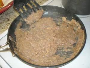 Then we had some leftover cooked pinto beans from last week in the fridge, so Benzo took a stab at making refried beans. He basically drained off some of the liquid, then mashed them up in a bowl with a potato masher. He stirred in a few spices like garlic and salt and pepper and then cooked it in a skillet with a little bit of oil.