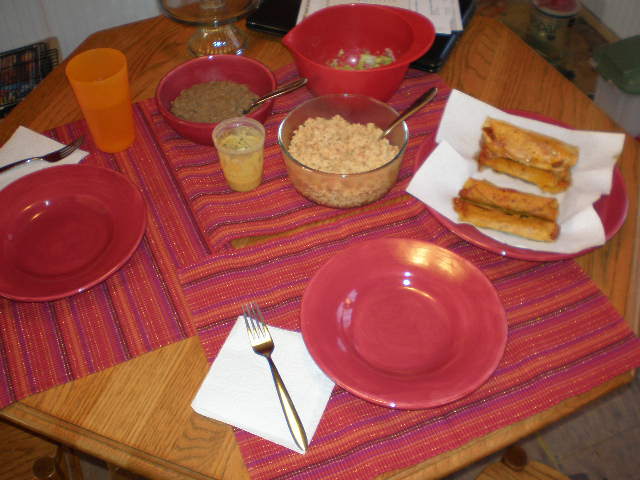 We decided to make a Mexican feast for dinner. Actually Benzo made most of it while I did laundry. At the store we bought some Soyrizo and corn tortillas, so Benzo made fried taquitos. Soyrizo is really good. You can’t tell it’s not meat at all! However it’s pretty processed so we only eat it now and then.