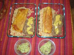 We also made spanish rice by cooking up some brown rice with chopped frozen tomatoes (from the garden last year) and 2 chopped pickled sport peppers (also from the garden last year) added to the cooking water.