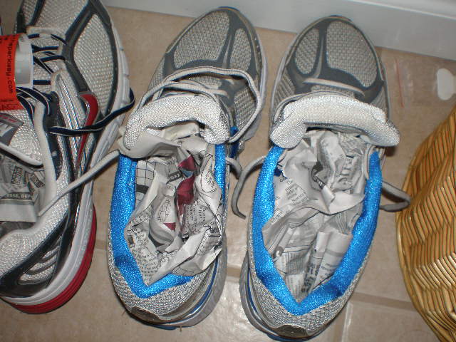 Side note: If you ever run in the rain and come back with soaking wet shoes, the best way to dry them out is by stuffing them with newspaper. The newspaper will absorb the moisture and they will be dry in 24 hours. Then you can use the newspaper to clean your mirrors or windows or recycle or compost it.