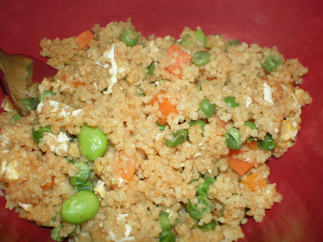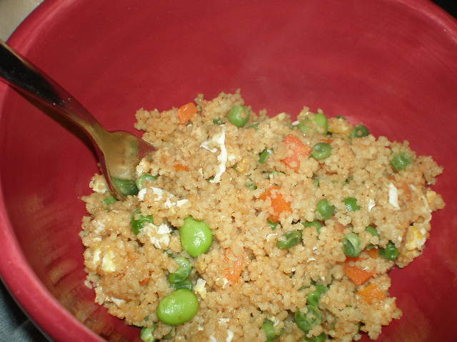 I told him that we had some random partial bags of frozen veggies that needed to be eaten so he came up with Veggie Fried Couscous. Using couscous instead of rice makes this a super quick dinner.