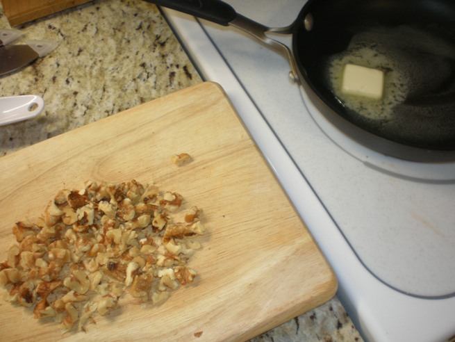 Melt butter or Earth Balance in a small skillet over medium heat.  Then add chopped nuts and cook for several minutes.
