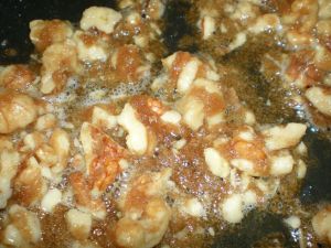 After the nuts have cooked for a few minutes, sprinkle them with brown sugar.  Stir to combine.  Reduce heat and let cook some more.