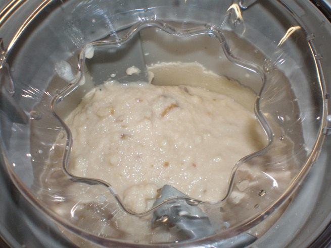 While the nuts are sizzlin’, mix together the soy milk, yogurt, maple syrup, vanilla and salt in a large bowl.  I had trouble getting the yogurt to mix with the milk so I whipped out my immersion blender to get the job done.