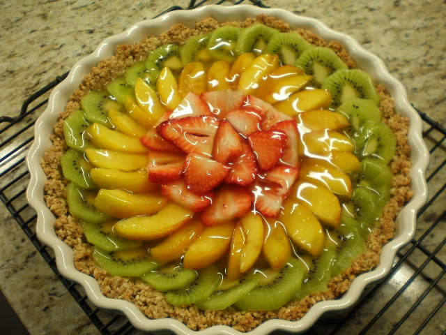 One fun thing we did yesterday was a BBQ get together with Do-Dad’s side of the family. My aunt and uncle hosted and everyone brought something to share. I was debating what to bring all week until Friday when this post with a recipe for a Fresh Fruit Tart popped up in my Google Reader over at No Meat Athlete. I was sold instantly by the pictures and how easy the recipe looked. Here’s a preview of the finished product: