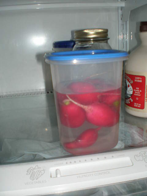Once radishes are washed and trimmed, I like to store them in a container of water in the refrigerator.
