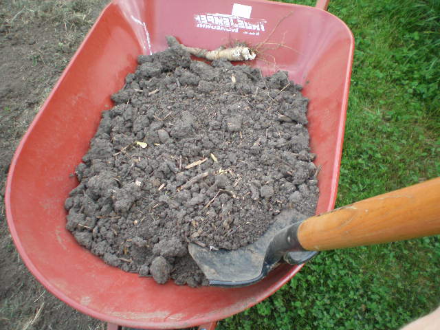 Fill the hole in with finished compost. We turned the finished compost into our wheelbarrow earlier this spring: