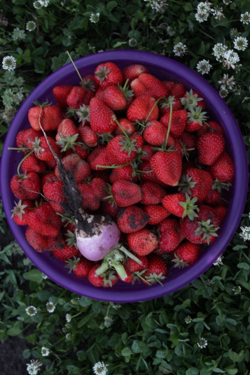 Here’s the rest of last night’s harvest.  More strawberries and the lone turnip.