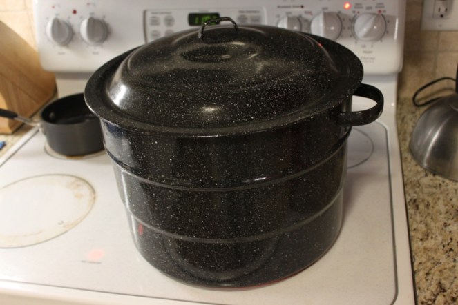 1. Water bath canner. I have a 7 quart jar Water-Bath Canner that I bought on sale at Westlake last summer for about $17. A water bath canner is basically a giant pot with a rack for the jars. I can process up to 7 quart jars at a time in the one I have. But I don’t have to do that many every time nor do I have to do quart jars. It works for all sizes. Water bath canners come in different capacities so the size of your family and the amount of canning you plan to do should determine what size you need.