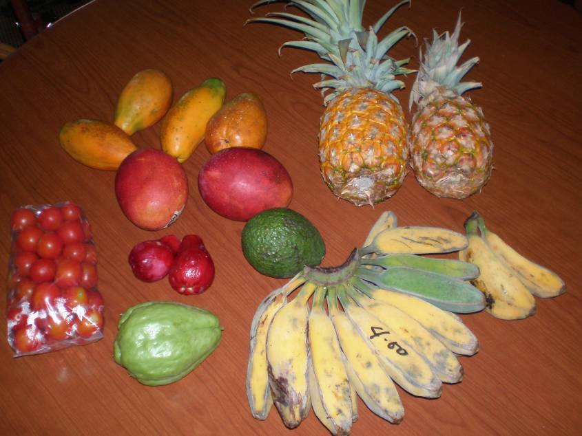 In the picture above there is a bag of cherry tomatoes, 4 yellow papayas, 2 mangoes, 2 mountain apples, 1 avocado, 2 pineapples, a large bunch of ice cream bananas and another light green fruit that I don’t remember what it is called.