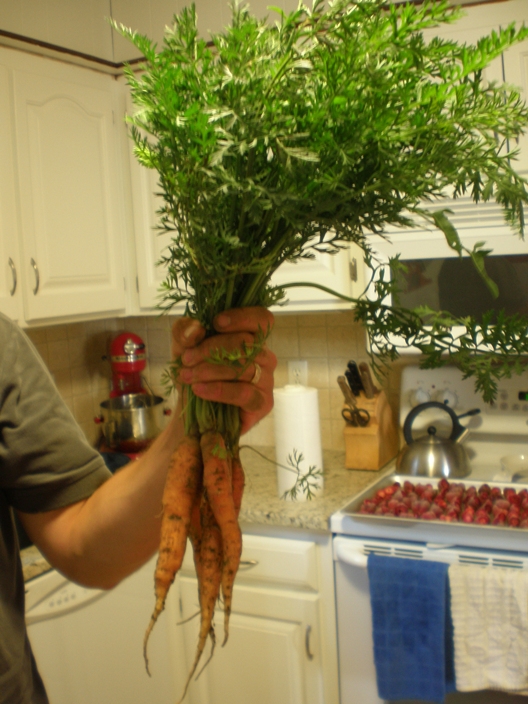 Benzo also dug up some of our carrots this weekend. I love how the tops are four times as large as the actual carrot. Based on the tops you would think we had some giant carrots in the ground. But nope they are normal-sized carrots.