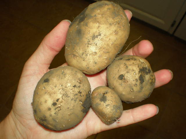 Well looky there! The potato plants may produce something edible after all. I am pretty excited. But I need to read up on when I am supposed to dig them up. Should I do it all at once? Or just a few at a time? If anyone has any knowledge on harvesting potatoes, let me know.