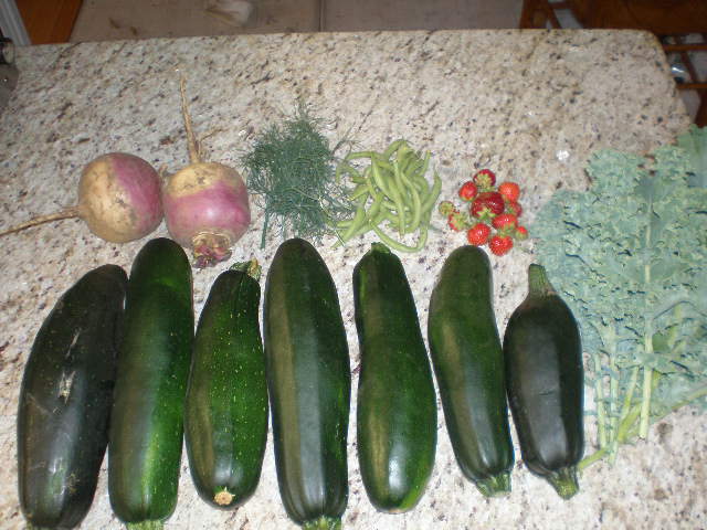 Also pictured from left to right are two turnips, a pile of dill, a few green beans, a few strawberries and a bunch of kale. Not pictured are more potatoes that I dug up as well.