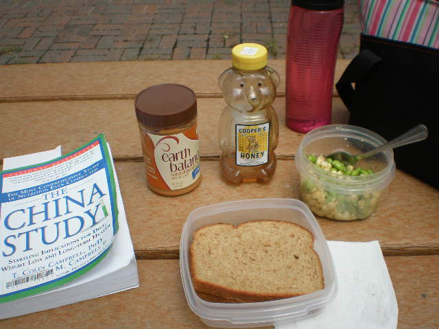 I had a really nice lunch today at my favorite little park. I packed a peanut butter and honey sandwich and some corn and edamame salad. I brought along The China Study to read while I ate.