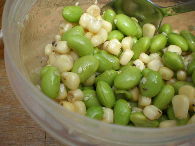 This corn and edamame salad was simple and delicious. I randomly threw it together this morning. I remember seeing something like this in Veganomiconwhen I borrowed it from the library this spring. I don’t remember how the recipe went at all though, so I just improvised. In a container I mixed about 1/2 cup frozen corn kernals and 1/2 cup frozen shelled edamame. Then I added a few pinches of seasame seeds and a drizzle of balsalmic vineagar dressing. Pop the lid on and shake it up to mix the ingredients. I let it thaw all morning until lunch and then ate it at room temperature. I really liked it.