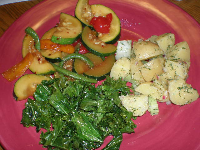To go with the potato salad, Benzo made a veggie stir fry with one of the huge zucchinis, the few green beans and some bell pepper strips from the freezer from the garden last year.  I made a side of sauteed kale.  The stir fry was super delicious but the kale was only so-so.  I don’t think I cooked it long enough.  The only things on this plate not from our garden are the red onion and celery and the vinegars and spices except the fresh dill.