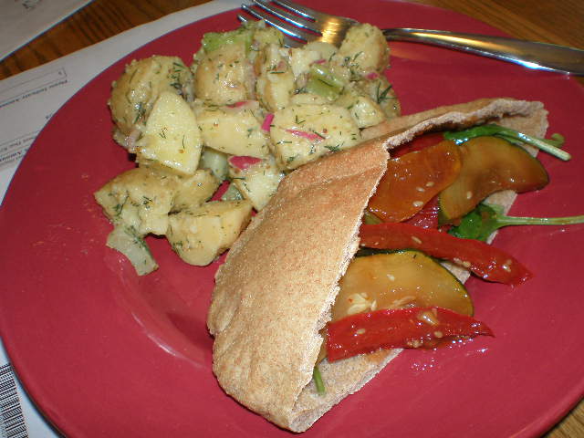 This morning we went on a food shopping spree and spent a small fortune on groceries.  But I love a stocked kitchen, especially when it’s stocked with lots of fresh produce.  When we got back we had lunch immediately.  I packed some of the extra stir-fry veggies in a pita pocket with spinach and had some of the leftover potato salad.